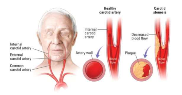 경동맥은 외경동맥과 내경동맥으로 나눠지며, 외경동맥은 두개골 밖의 피부나 근육에 혈액을 공급하고 내경동맥은 두개골 내의 뇌나 신경조직에 혈액을 공급 한다. 외경동맥은 좁아지거나 막히더라도 다른 혈관을 통해서 비교적 풍부하게 혈액 이 공급되므로 특별히 문제가 발생하지 않는다. 내경동맥은 좁아지거나 막히면 뇌에 혈액공급이 감소할 수 있으며, 내경동맥 벽 에 침착되어 있는(쌓여서 들러붙어 있는) 지방조직들이 떨어져 나와 뇌혈관의 말단부위로 흘러가 혈관을 막을 수도 있다. 이처럼 내경동맥을 포함한 경동맥이 좁아지는 경우를 경동맥 협착증이라고 지 칭하며, 이는 혈류를 감소시키거나 혈관을 막게 되어 허혈성 뇌졸중의 원인이 된다. 따라서 경동맥 협착증이 있는 경우 뇌졸중의 예방과 치료를 위해 치료 대상이 된다.