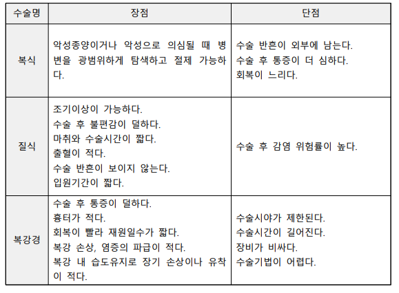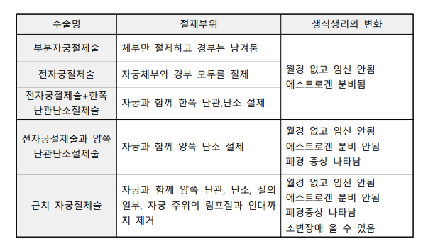 질식 전자궁절제술은 질구를 통해 자궁 전체를 절제하고 분리된 자궁을 질을 통해 제거하는 경우로, 주로 자궁탈출증이 있을 때 이용되며 대개 척추마취로 시행하게 된다. 만일 질구가 너무 좁거나 자궁의 종양이나 난소에 병변이 의심될 때는 이용할 수 없다. ③TLH: Total laparoscopic Hysterectomy