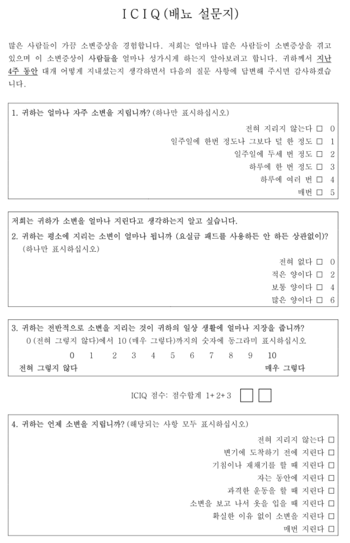 카테고리 없음 비뇨기과 ICIQ 임상 요실금관련 설문척도 by 찬찬b 2024. 8. 22. 비뇨기과 임상에서 사용하고 있는 ICIQ 요실금 배뇨 설문지 양식입니다 :-) 반응형 공유하기 게시글 관리 하고싶은게너무많아