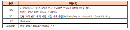 * 적혈구 제외한 혈액(혈소판, 혈장성분 등): 15분 이내에 수혈이 종료되지 않았다면 10분 이내 활력징후를