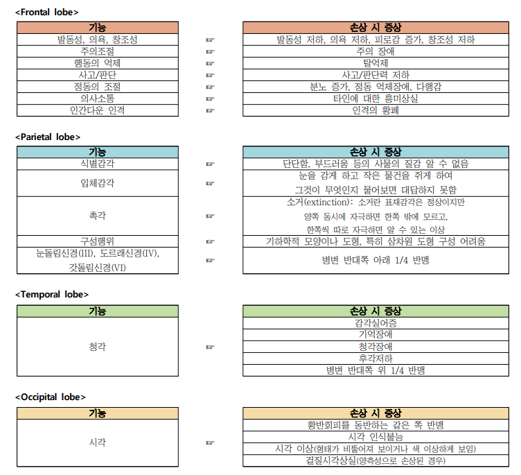 - 손상 시 깊이 지각, 완전한 시력 및 감각의 전반적인 통제력 상실