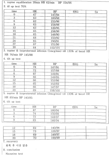 실신이나 어지럼증의 원인이 심장의 자율신경 계통에 원인이 있는지를 판정하기 위한 검사이다.