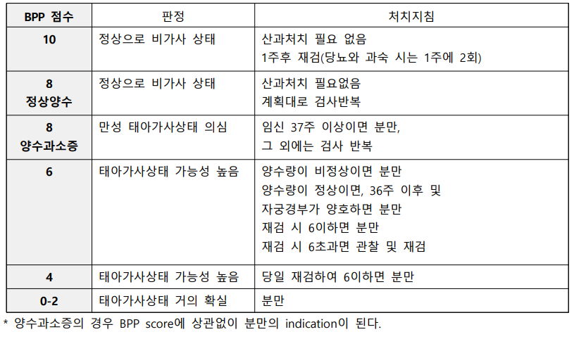 (1) 목적: 태아의 수, 태위, 태아 생존력 확인, 태반의 위치, 태아 선진부, 양수의 양, 재태연령 측정, 태아 심 장활동, 모체 골반 종양의 유무, 비정상적 해부학적 구조 등을 조사하기 위해 시행된다. 또한 양수천자와 같은 침습적 검사 시행 시 합병증을 줄이기 위한 가이드로 활용되기도 한다.