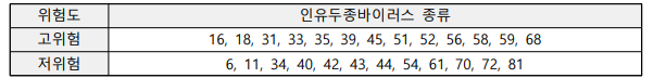 ※ 인유두종 바이러스 (human papillomavirus, HPV) 자궁경부암을 일으키는 바이러스로 자궁경부암뿐만 아니라 호흡기, 눈, 항문, 성기주변 등에 사마귀 형태의 병변을 일으키는 바이러스로 알려져 있다.