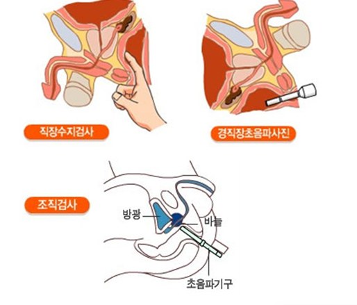 - 수지검사를 통해 촉지 할 시 손가락 관절(knuckle)과 같은 느낌이 난다. 촉진이 느껴지는 약 60-70%의 경우, 이미 전이가 진행 중이라고 한다. 직장수지검사에 양성으로 나타나게 될 경우, PSA의 수치와 관계없이 초음파검사와 생검을 실시한다.