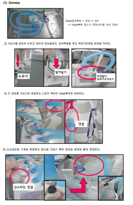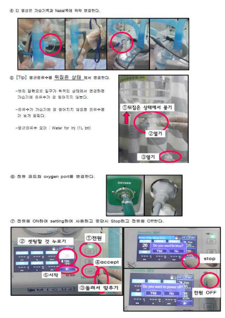 6) 장비교환 및 소독 ① 매일 박테리아 filter 및 환자의 circuit 상태 육안으로 확인 ② 환자가 바뀔 때마다 ③ 한 환자가 장기간 사용시 7일에 한 번씩 filter, 한 달에 한 번씩 circuit, humidification chamber 교환 nasal cannula과 humidification chamber는 한 세트. 사용한 filter 및 circuit은 재소독 불가